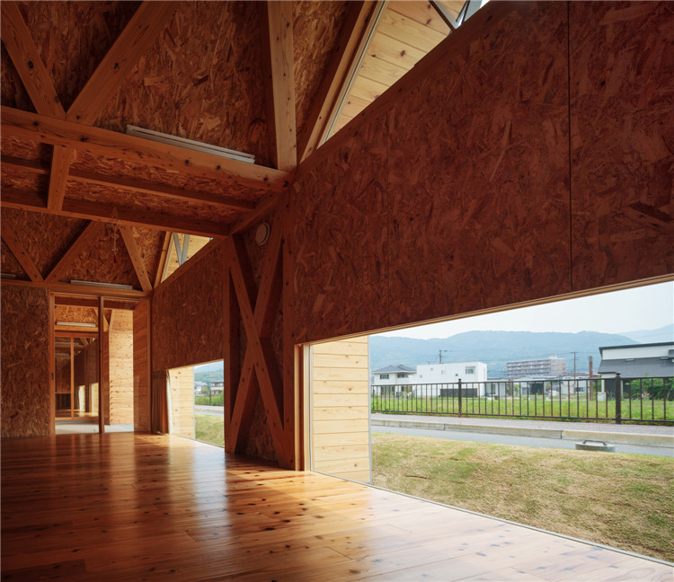 建筑的所有結(jié)構(gòu)不是天花板就是墻體,木桁架梁傾斜設(shè)置,是屋頂?shù)幕A(chǔ)結(jié)構(gòu)木構(gòu)件。這樣的設(shè)計滿足了客戶對于“保育室被木頭包圍”的要求,減少了建設(shè)成本。此外,通過降低天花板的高度,木材長度被縮短了,對空調(diào)的需求也降低了。由于天花板幾何形狀不規(guī)則且窗戶為梯形,因此雖然天花板最低的地方只有2.2m左右,但即使是成年人也不會感到壓抑。