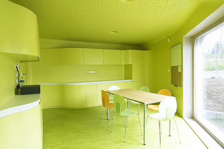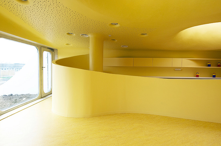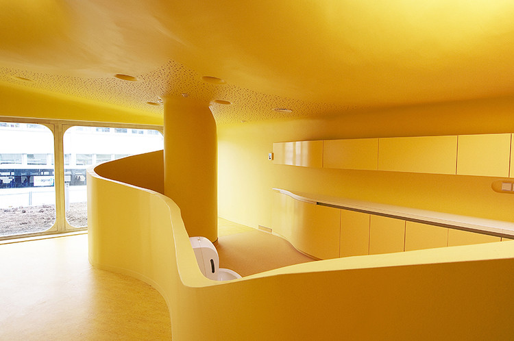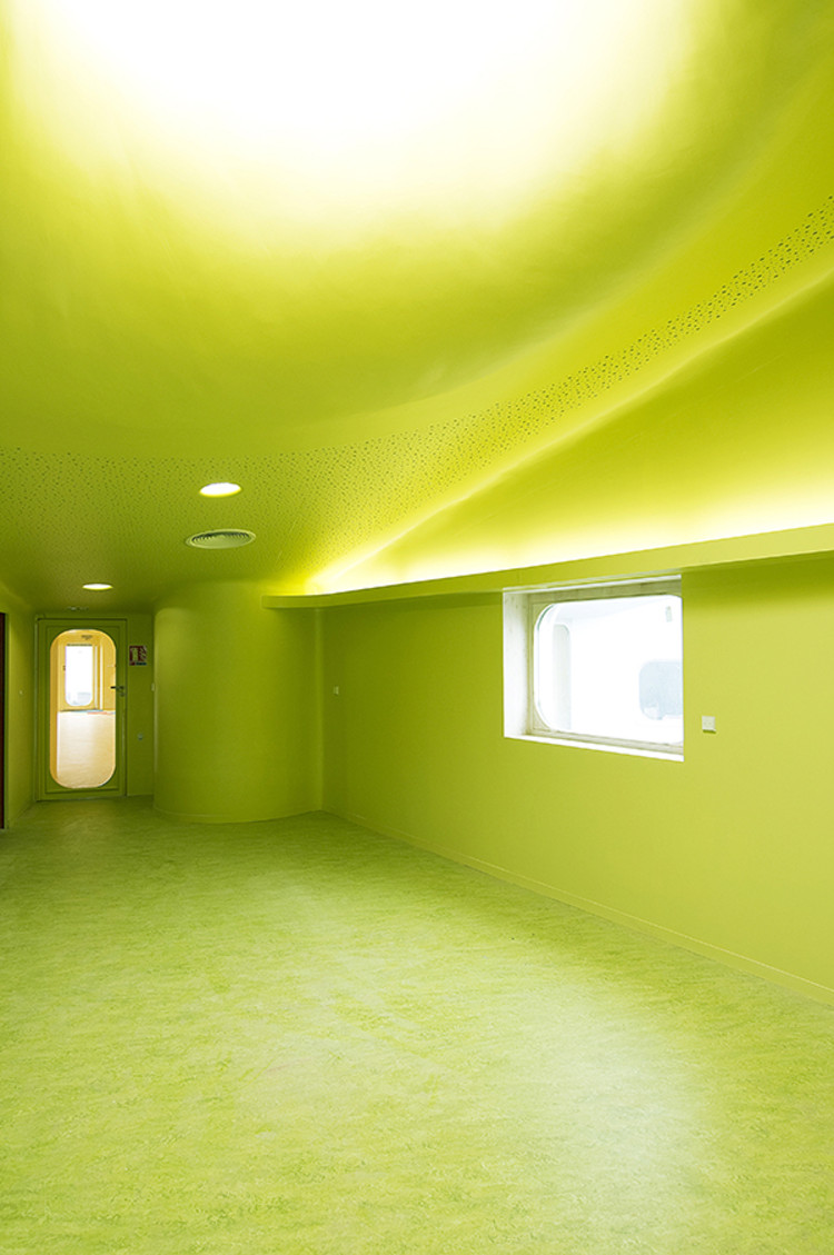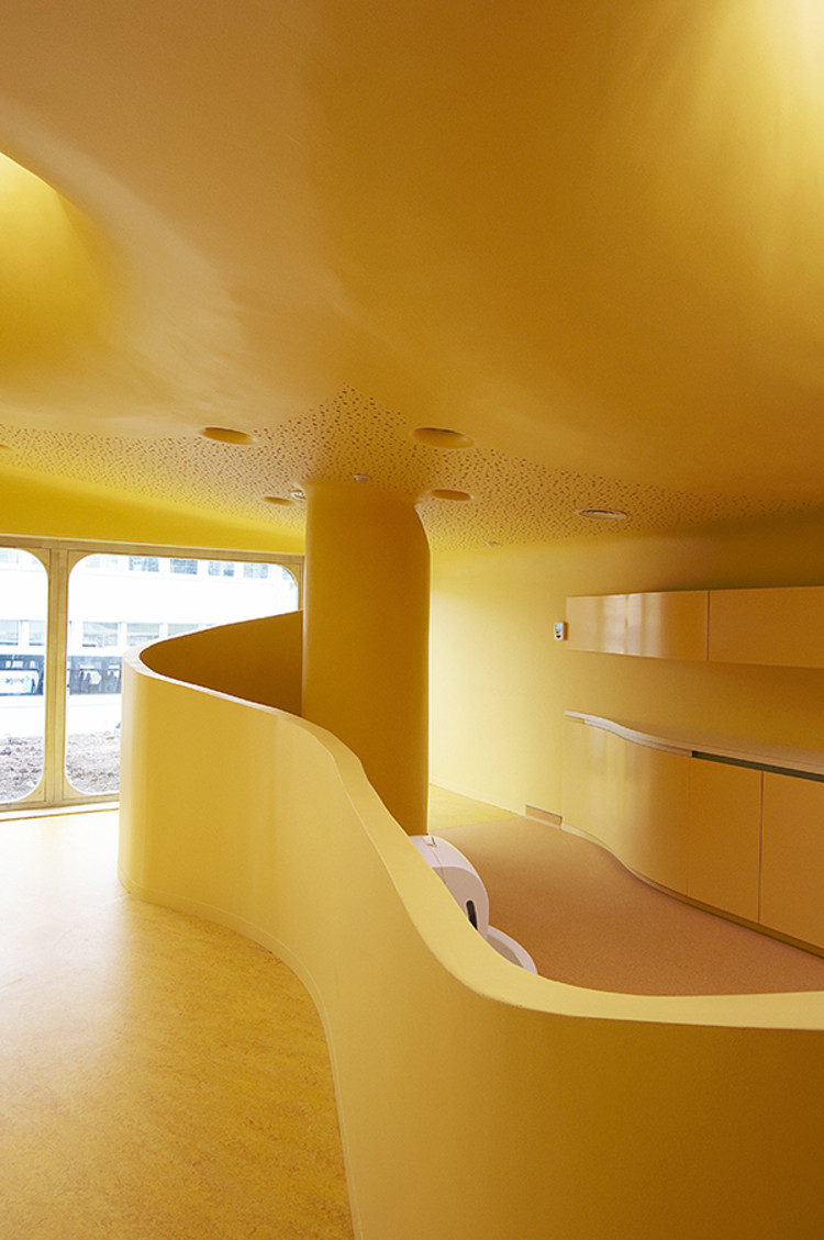 為了保證設施的安全,所以在內部配件的設計中,消除了所有的直角結構,并提供平滑彎曲的邊緣,即使連鋒利的邊緣也被倒圓。這些是該建筑的特點之一,外墻像波浪一樣進入了內部空間。