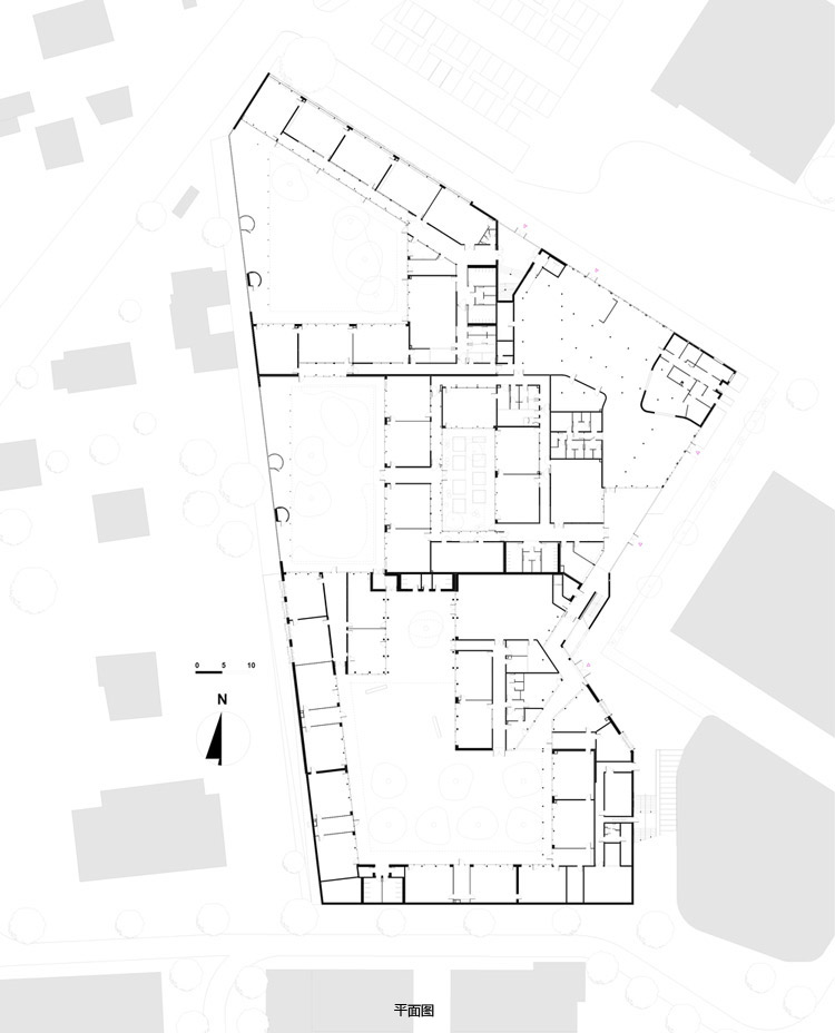 新大樓對重新定義未來的城市中心的都市空間有著重要意義。建筑北面是市政廳,南面正對公寓樓圍合的廣場,西側(cè)是私人住宅。建筑師完善既有的零散城市空間,建設(shè)完整的都市空間。