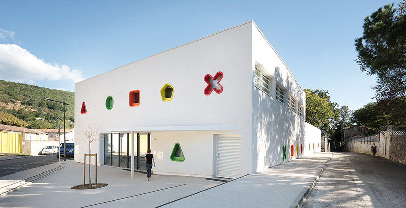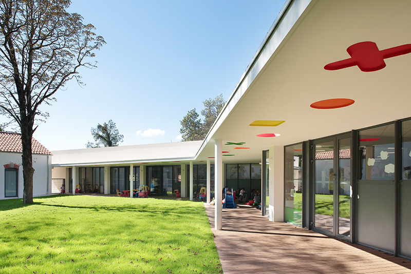 這個(gè)育兒中心是以之前的一個(gè)農(nóng)業(yè)部門改建而來(lái),位于兩條狹窄的街道的街角之處,值得一提的是育兒中心與l’Ecureuil療養(yǎng)院建在一起:兩個(gè)建筑之間有一個(gè)漂亮的花園里面有很多栗子樹,增加了它們之間的聯(lián)系和代際關(guān)系。(幼兒園設(shè)計(jì))