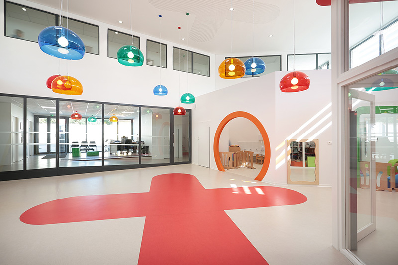 這兩個(gè)項(xiàng)目之間的關(guān)系是基于尊重和樂(lè)趣。彩色的筆觸到處都是,成為孩子們玩耍的形狀。幼兒中心的開放式陽(yáng)臺(tái)和室外操場(chǎng)直接回答養(yǎng)老院的直線和優(yōu)雅的外觀。他們中的每一個(gè),避免任何分區(qū)。充滿樂(lè)趣。彩色畫隨處可見,給孩子們會(huì)帶來(lái)了歡樂(lè)