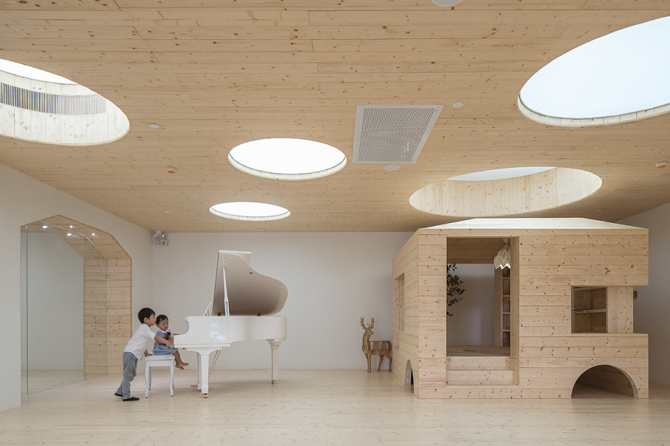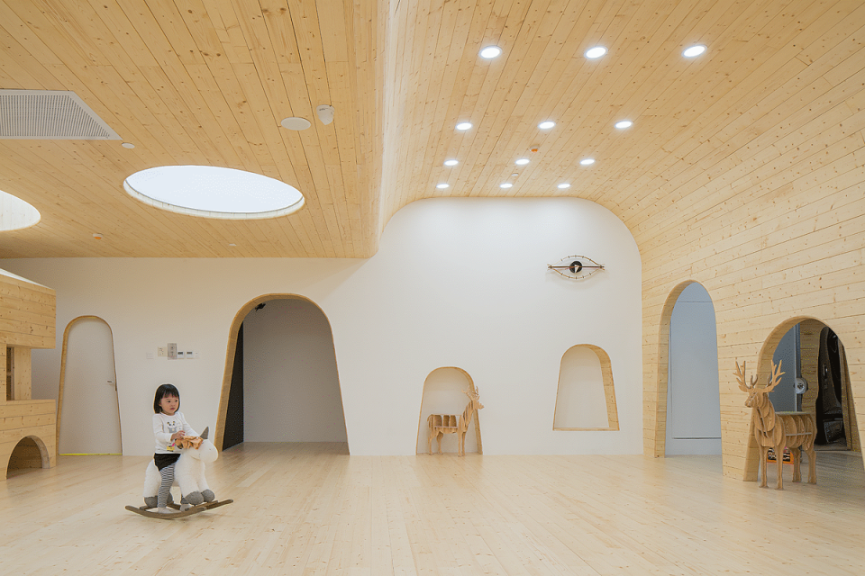 早教中心的設(shè)計(jì)分為地下室,一樓和二樓,地下室是老師們辦公和家長(zhǎng)培訓(xùn)的地方,一樓是孩子和家長(zhǎng)們的公共區(qū)域,采用白松木把地板和天花板的連續(xù)面包裹。這個(gè)空間就是孩子們被保護(hù)在世界的中心的小木屋,有個(gè)拱門(mén)去引導(dǎo)孩子們拾階而上,有飛鳥(niǎo)掠過(guò),有樹(shù)屋還有鮮花和明燈,之后是教室,其實(shí)更像是一個(gè)新世界的小角落,讓孩子們?nèi)ヌ剿髦R(shí)。這就是寶媽精心打造的兒童空間。