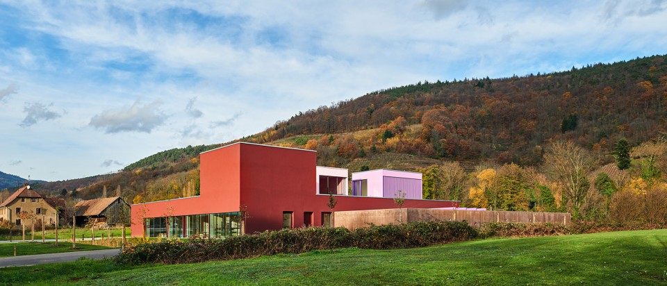 位于法國阿爾薩斯省一個小村莊的山谷入口處,建造著一所就像是用積木搭建兒童的樂園,環繞著幼兒園的蘋果樹和邊上連綿起伏的山丘隨著四季的變化成了幼兒園一道特別的背景,沿著幼兒園的邊界還有一條圍墻,墻上有著大小不一的圓孔,可以透過這些圓孔去看到外面的世界,這個很有趣的設計可以提供一些有趣的感覺,滿足了孩子們的好奇心,而這面有趣的圍墻則如同衛士一樣默默守護者在自由玩耍的可愛孩子們。