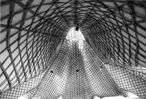 在社區中心的幼兒園是以一個正方形的網格作為模數基礎,在中央隆起一個三維褶皺的建筑表皮,看上去就像是在地上鋪上一塊巨型的手帕然后抓起來的感覺,褶皺的骨骼部分是由綠色環保的竹子編制而成,采用竹子編織形成一個竹子網格曲面有著巨大的空間,在竹子外部在增加上保溫層最外層則是用鋼筋混凝土作為整個建筑的“外衣”,整個建筑在園方看過去就想是隨風飄動的少女裙擺十分的引人注目。