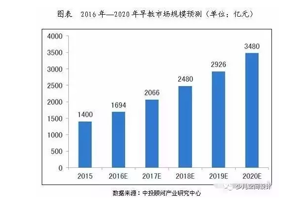2015年我國早教市場規模已經達到1400億元左右,發展速度較快,現階段國內早教市場還有巨大潛力尚未開發,隨著家長重視度愈來愈來高,早教的商業模式日益成熟,早教市場規模將進一步擴大,中投顧問產業研究中心預測,到2020年我國早教市場規模將達3480億元,未來五年增速約為20%。
