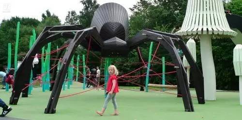 這個公園里的游樂場有巨大的蜘蛛、蛛網(wǎng)和蘑菇,小朋友可以在里面爬繩網(wǎng)、玩滑梯。