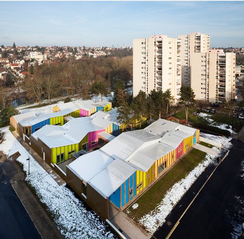這是由法國事務所ECDM設計的一個托兒所項目,它呈現出起伏的混凝土墻壁,這種漣漪的效果是通過采用一系列的預制板面形成的,它們環繞建筑的三側,只有一側包含開口的窗戶。一個院落位于兩層樓的中心,周圍環繞為孩子們準備的房間,可以容納66名孩童。一個樹形的金屬傘遮擋結構為院落提供遮陰,從街道看去好似漂浮在屋頂之上。