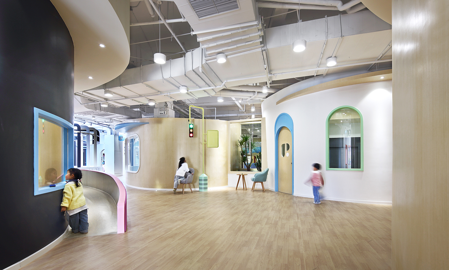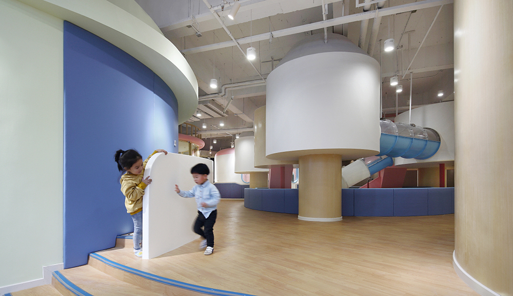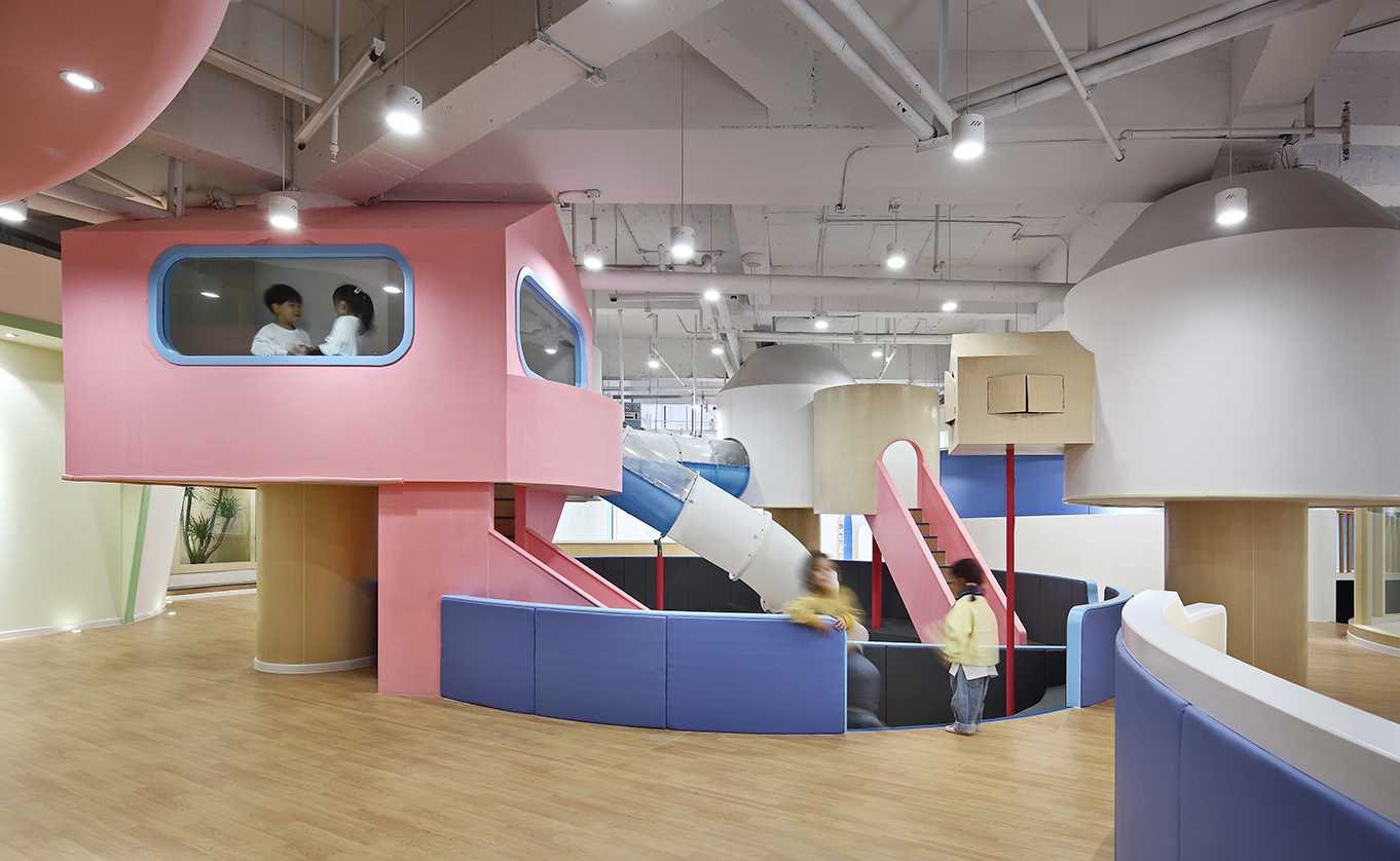 游戲是孩子的活力之源,也是孩子通往世界的途徑。設(shè)計(jì)師將游樂(lè)區(qū)布局在室內(nèi)的中心位置,讓孩子的歡聲笑語(yǔ)激活整座“城”。孩子們會(huì)帶著好奇和期待爬上梯子,穿過(guò)可愛(ài)的小木屋,在管道中匍匐前進(jìn),然后“咻”地一下滑入下沉的球池,在不斷變化動(dòng)作和愉悅的體驗(yàn)中獲得身心的鍛煉和能力的發(fā)展。