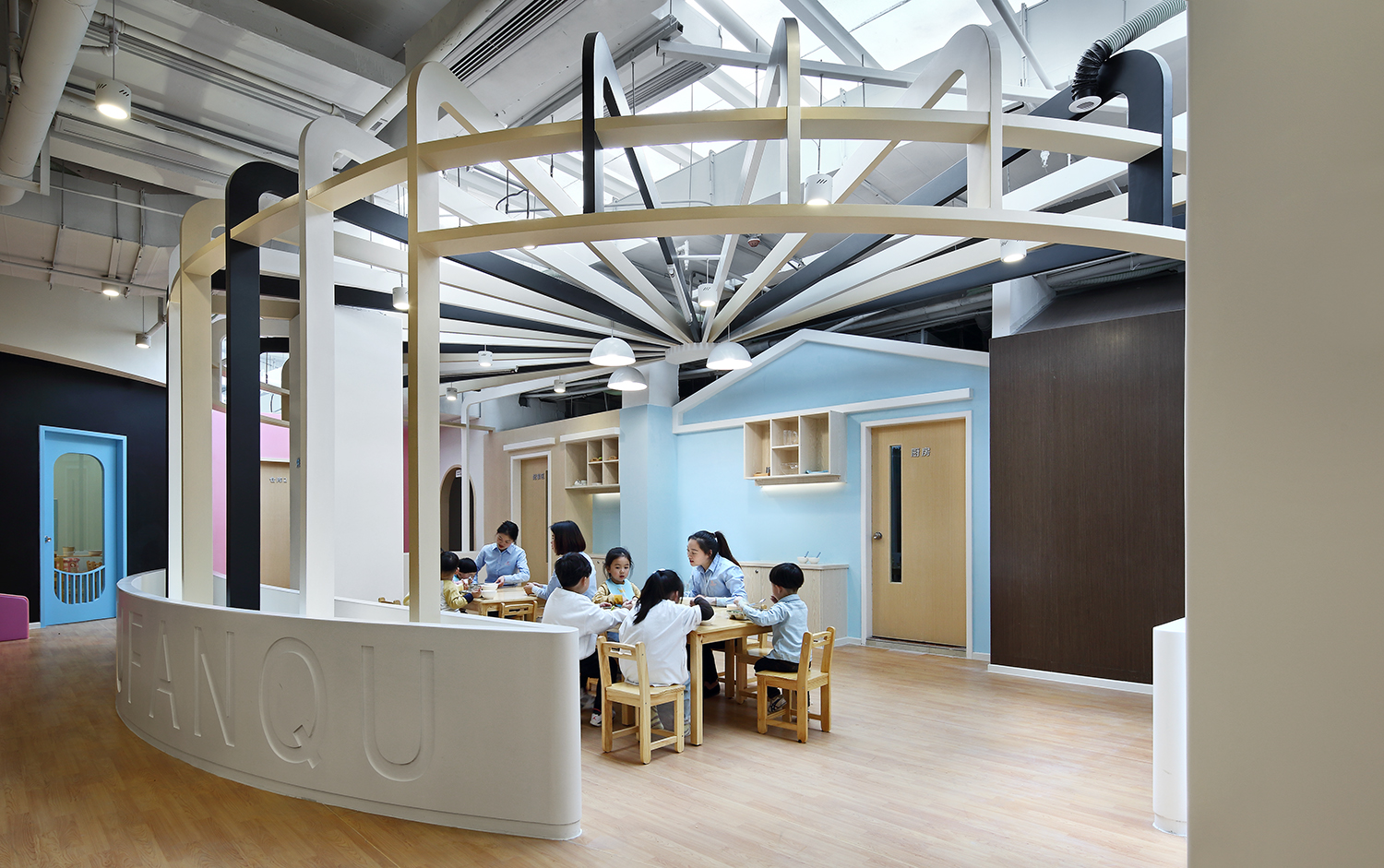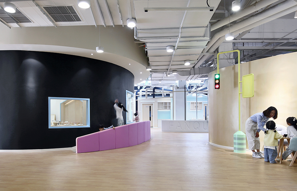 從個(gè)體出發(fā)形成集體,“竹節(jié)房子”一間間挺立,漸漸組合成一座豐富多彩、包容、開(kāi)闊的“城市”。教室即“城市居住區(qū)”,分布在城市的東南西北中各個(gè)方位;廚餐區(qū)化身“城市美食街”;走廊為“道路街區(qū)”;中部游樂(lè)區(qū)是“城市娛樂(lè)區(qū)”,細(xì)致到游樂(lè)設(shè)施、崗?fù)ぁ⑸啼伒榷加信c之對(duì)應(yīng)的微型建筑。