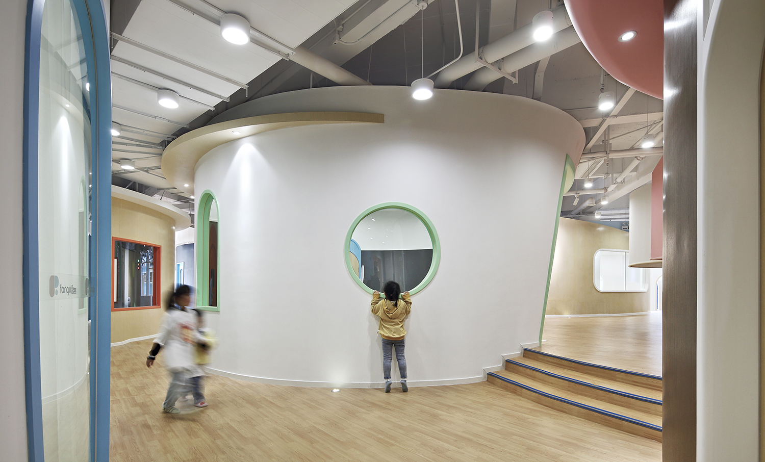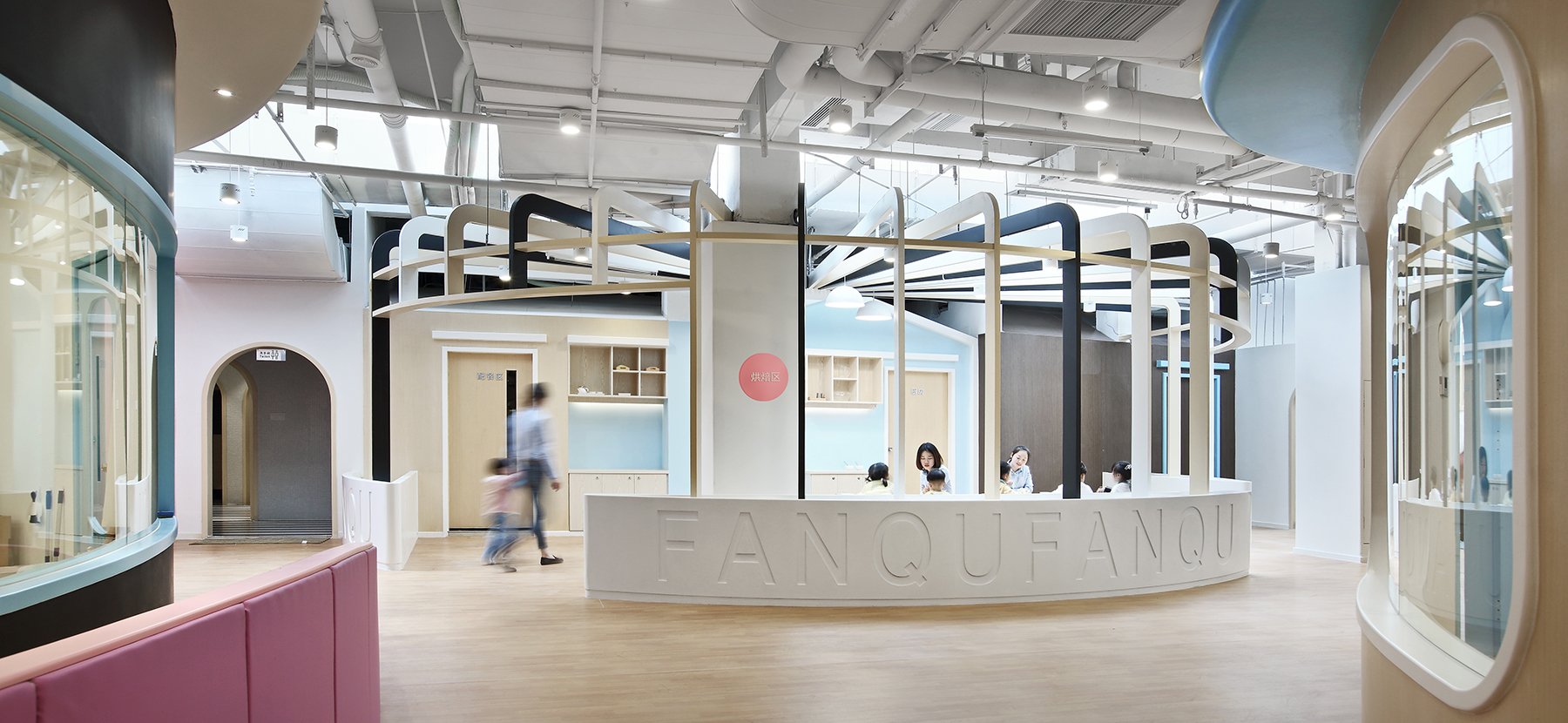 設(shè)計(jì)師延伸“番趣”的品牌形象,打造項(xiàng)目主入口外觀,品牌元素與園區(qū)的展示需求相融合,構(gòu)成明凈活潑的外觀形象。門頭和前臺(tái)造型取自品牌“F”元素,以親切的姿勢(shì)歡迎小朋友和家長(zhǎng)的到來(lái)。