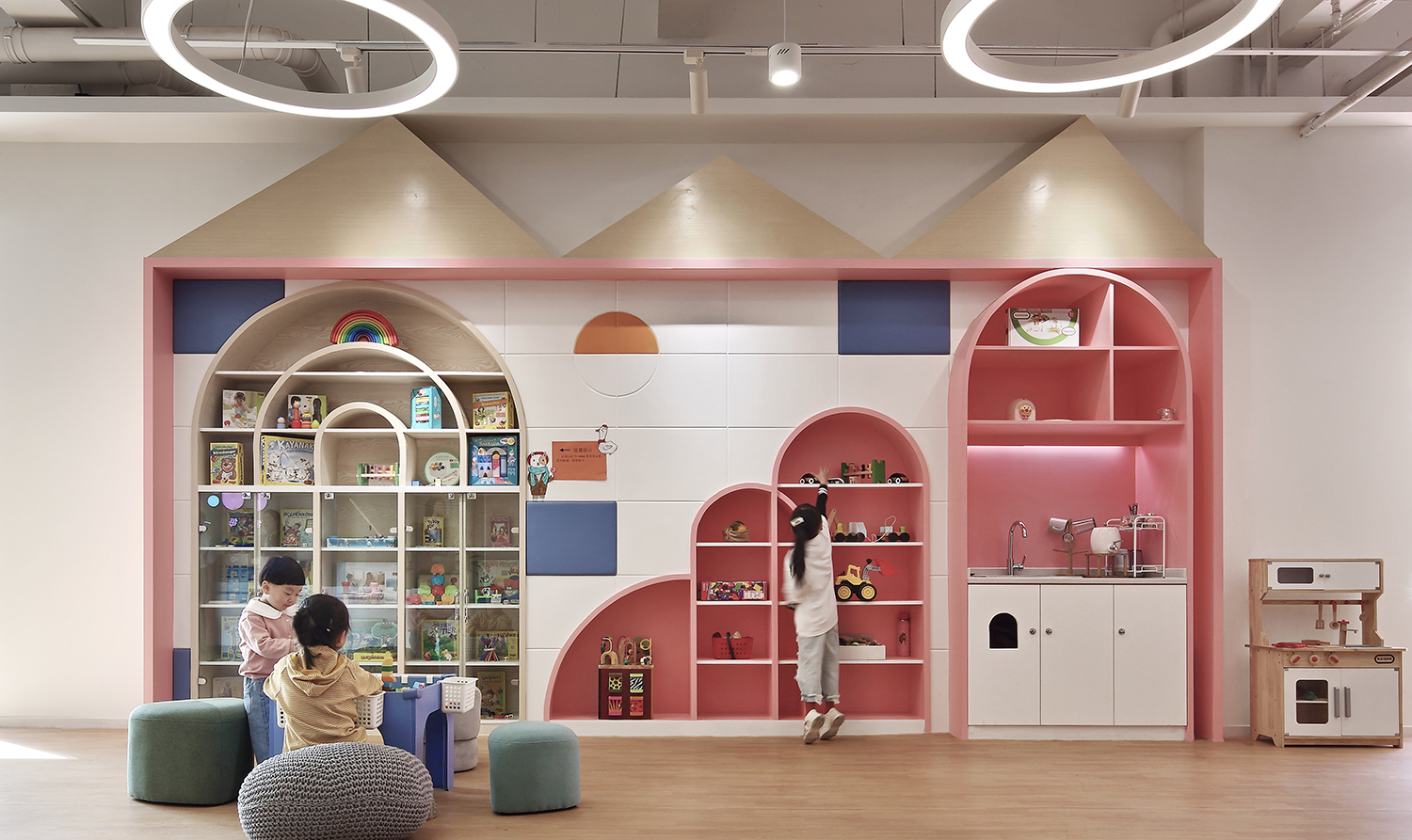 設(shè)計(jì)師將這些單個(gè)場(chǎng)所及其代表性元素,一一落實(shí)到番趣兒童成長(zhǎng)中心后,不僅形成了有趣的分區(qū)和大量多元化的小角落,還驚喜地產(chǎn)生了很多趣味性的視覺(jué)呈現(xiàn)。室內(nèi)的承重柱也不知不覺(jué)被設(shè)計(jì)師巧妙隱藏了起來(lái)。