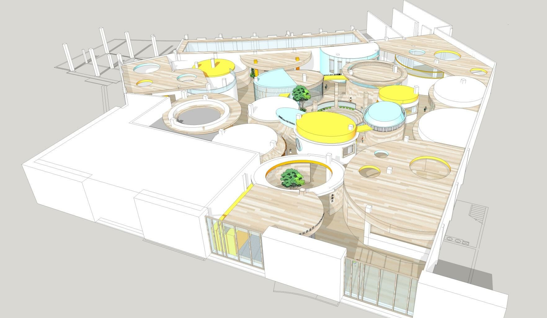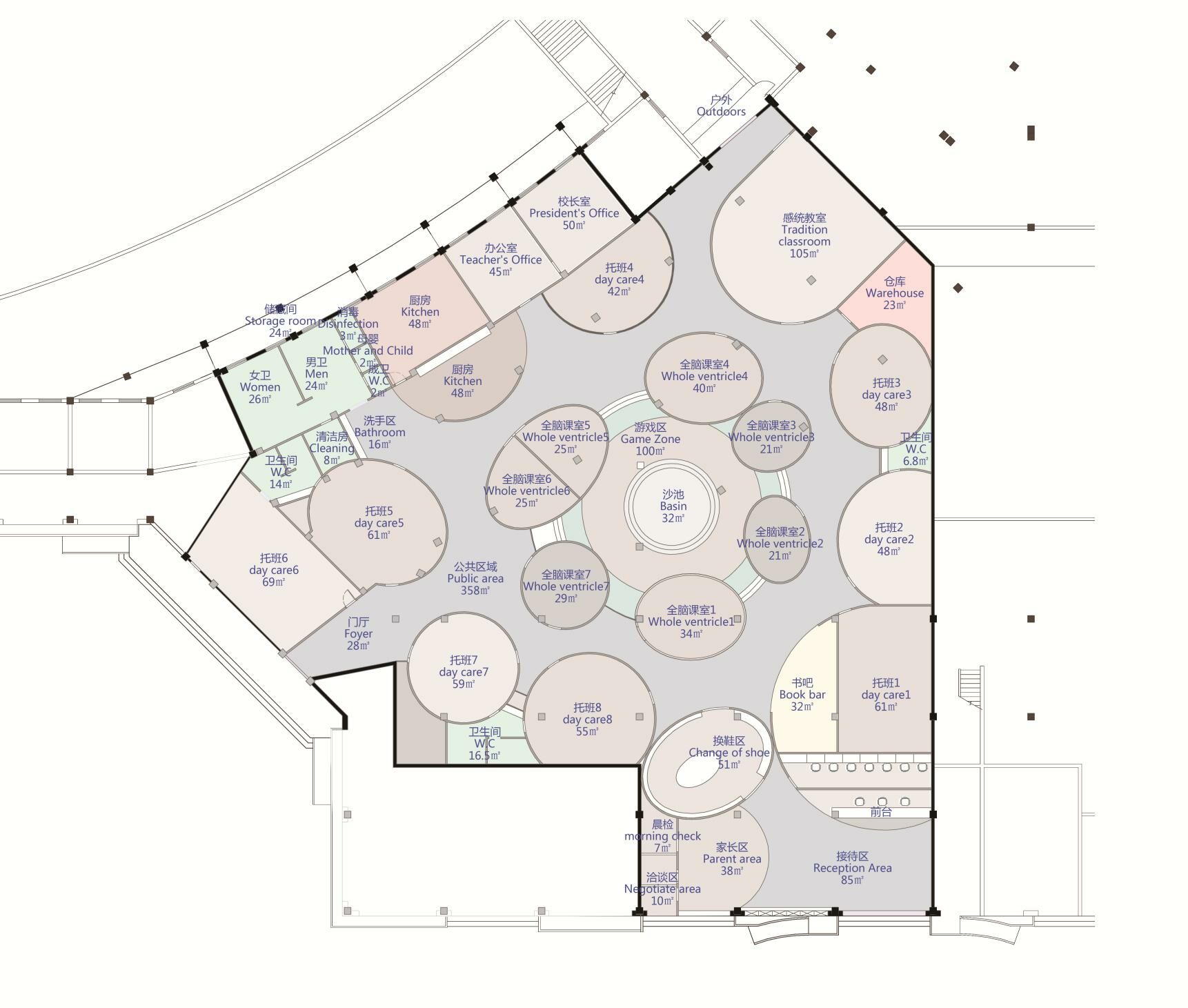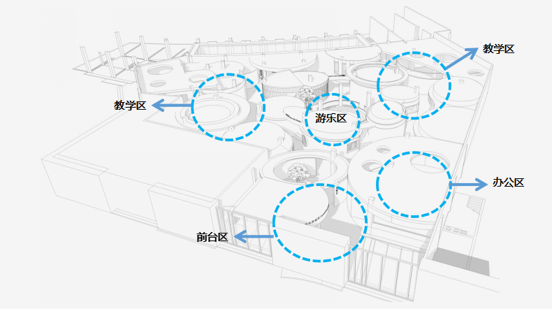 此次設(shè)計(jì)涉及早教和托育兩大版塊功能需求,包括16間教室、1個(gè)游樂(lè)區(qū),以及書吧、辦公區(qū)、廚餐區(qū)等。設(shè)計(jì)師將原有場(chǎng)地進(jìn)行清理和重新分割,根據(jù)項(xiàng)目需求和場(chǎng)地情況將中部規(guī)劃為早教區(qū),托育教室則圍繞早教區(qū)環(huán)形安置,主門在南面,接送門在西側(cè)。