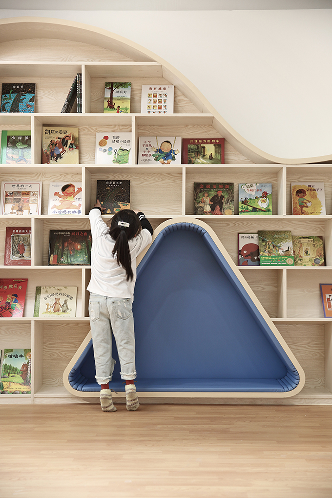 設(shè)計(jì)師將室內(nèi)采光最充足的區(qū)域留給餐廳、繪本區(qū)等公共區(qū)域,同時(shí)打造開(kāi)放感,以此盡量延展陽(yáng)光在成長(zhǎng)中心的照射范圍。當(dāng)陽(yáng)光進(jìn)來(lái),仿佛天燈將整座城市點(diǎn)亮。孩子們能夠在陽(yáng)光下活動(dòng),吃飯、讀書、玩樂(lè),隨著時(shí)間的變化觀察光影,感受陰晴雨雪和四季變化。