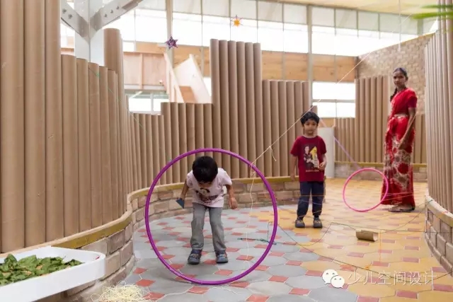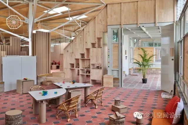 通過滲透性的室內設計,鼓勵了孩子們的探索學習——不同高度的墻體圍合了懸挑的教室和公共空間,其上是穿孔的天窗。屋頂收到8根柱子的支撐,每一個形式都是樹枝分叉。這個樹的形式,在形成結構元素的同時,讓屋頂的高度能夠更為孩子們所感知。“樹”下的空間同時重新詮釋了學習的區域,這樣的場景在郊外隨處可見。