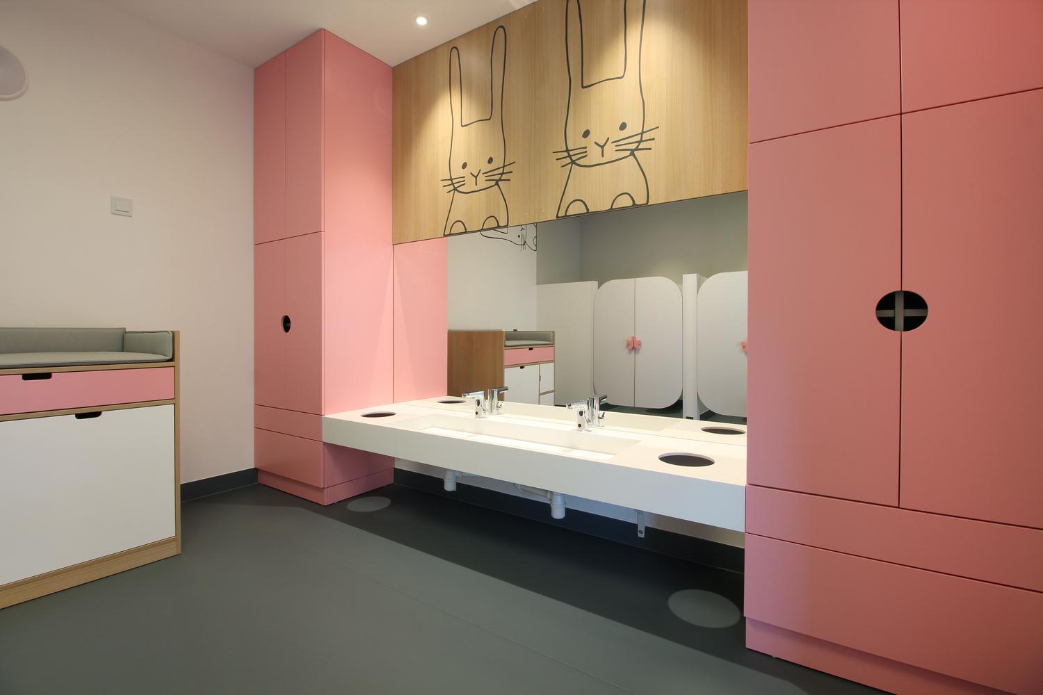 幼兒園衛生間設計宜各班獨立設置,衛生間與盥洗區之間宜隔開設立,高度不應妨礙老師隨時看護到孩子,要符合老師可以觀察到的高度。色彩選擇上,可以使用孩子們喜歡的亮色,造型上可以突出有趣,充滿童趣的空間環境。以孩子們的審美視角設計,能更好讓孩子們喜歡上幼兒園空間環境。